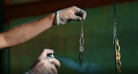 Пока грунтовка подсыхает, можно заняться ручками. Чтобы добиться равномерного покрытия, удобно подвесить их. После обезжиривания легким движением руки наносим чёрную глянцевую эмаль Decorix. Всего несколько минут — и фурнитура выглядит как новая.