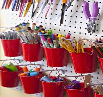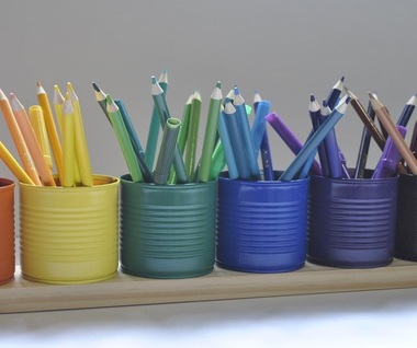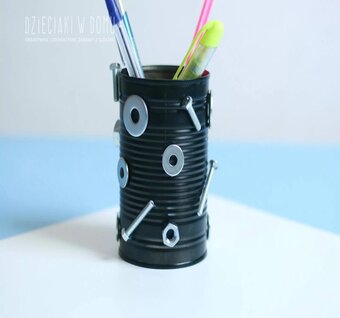 Банки из-под консервов или кофе — отличная основа для хранения канцелярии. После покраски они выглядят как покупные.