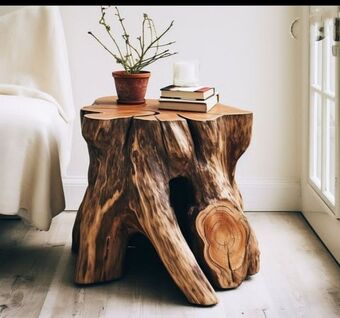Немного шлифовки, немного краски — и обычный пень превращается в оригинальный столик или подставку.