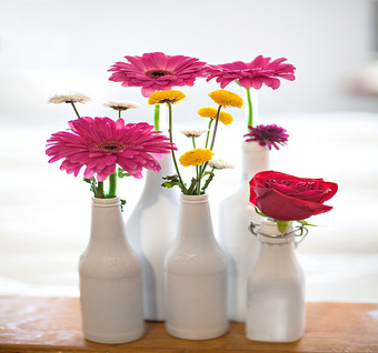 Пластиковая бутылка или старая банка легко превращается в стильную вазу. Главное — подобрать цвет под интерьер.