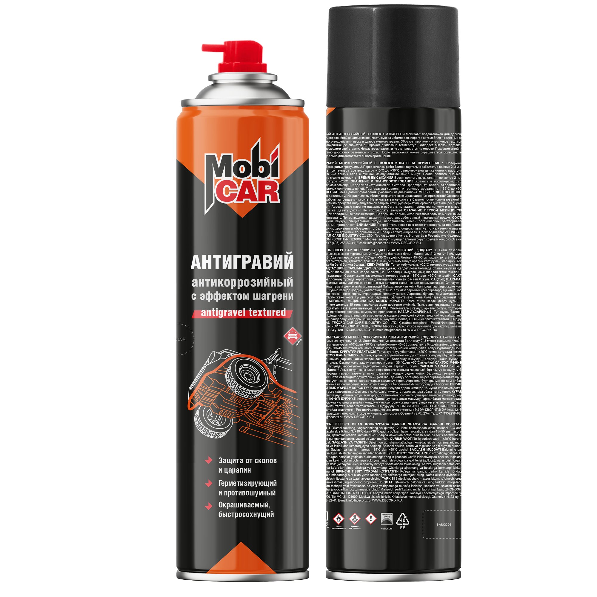 АНТИГРАВИЙ АНТИКОРРОЗИЙНЫЙ С ЭФФЕКТОМ ШАГРЕНИ MobiCAR® предназначен для долговременной антикоррозийной защиты нижней части кузова и бамперов, порогов автомобиля и колёсных арок от абразивного воздействия песка и ударов мелкого гравия. Образует прочное и эластичное текстурное покрытие, сохраняющее свойства в широком диапазоне температур. Обладает высокой адгезией и шумоизолирующими свойствами. Не растрескивается и не отслаивается на морозе. Покрытие устойчиво к воздействию дорожных реагентов и соли. После высыхания может окрашиваться большинством эмалей. Идеально для самостоятельного применения.