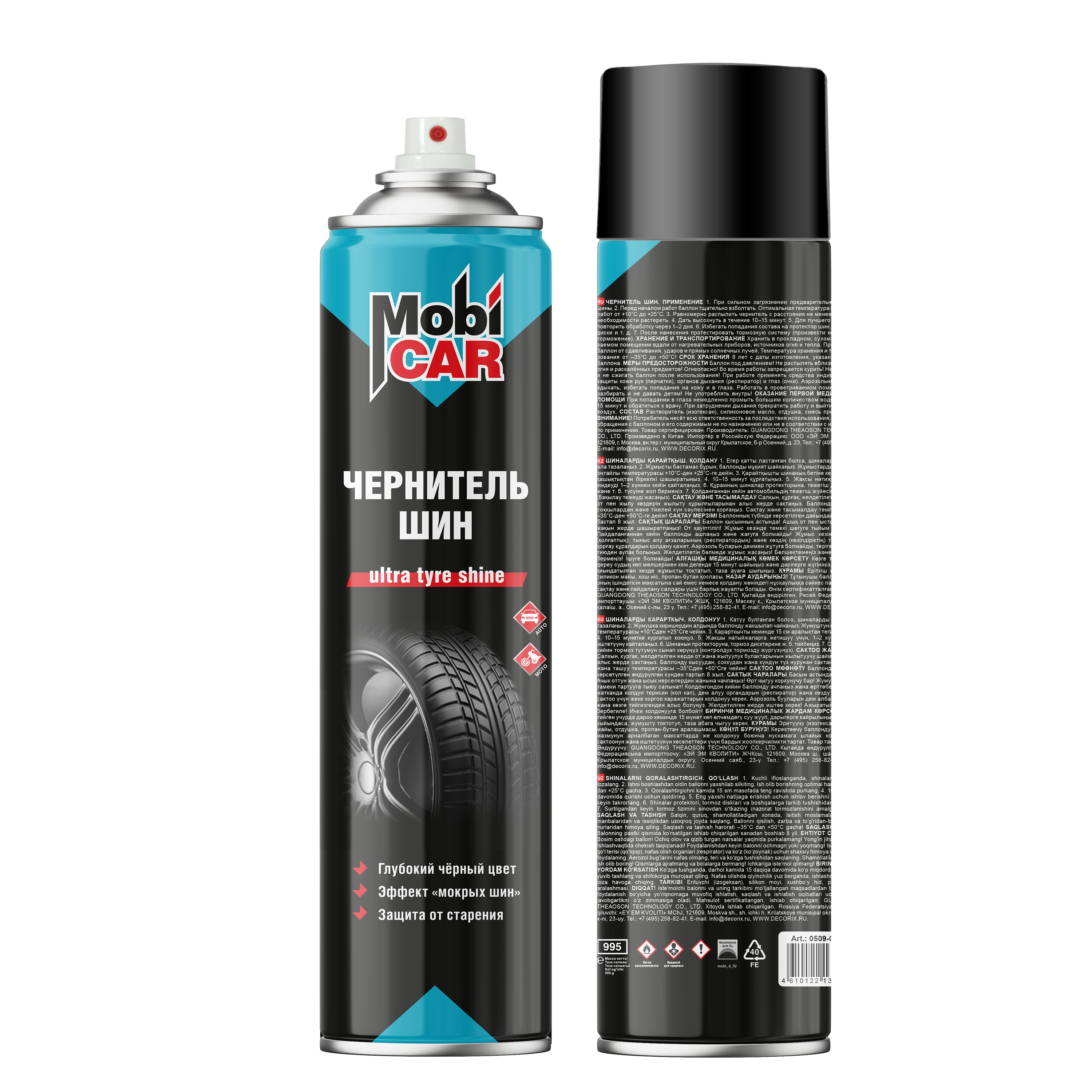 Профессиональный ЧЕРНИТЕЛЬ ШИН MobiCAR® предназначен для профессионального ухода и обновления боковых поверхностей покрышек и резиновых молдингов, придавая им глубокий черный цвет и влажный блеск. Формирует на поверхности шин грязеотталкивающую плёнку, предохраняющую от растрескивания и преждевременного старения. Придаёт шинам ухоженный глянцевый вид. Предохраняет обработанные поверхности от разрушения дорожными реагентами, осадками и ультрафиолетом. Продлевает срок службы шин и резиновых бамперов / молдингов. Используется как консервант при обработке шин перед сезонным хранением. Можно наносить на влажную и сухую поверхности.