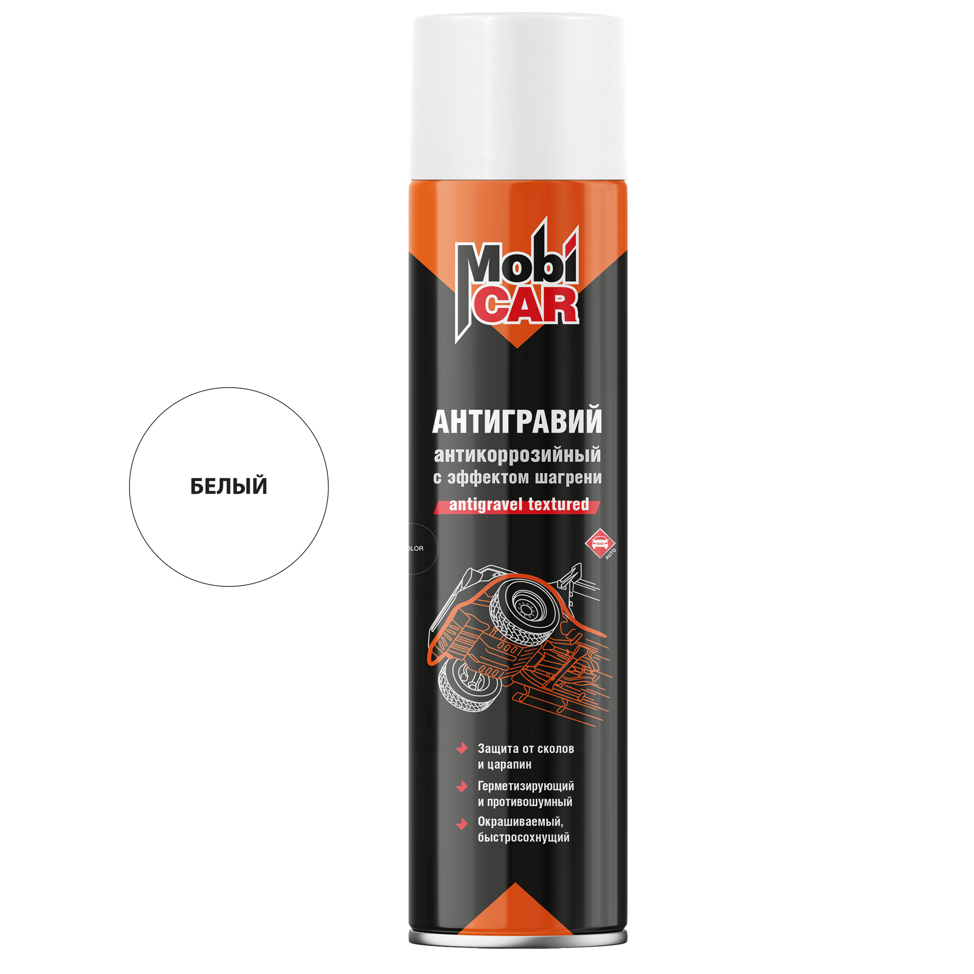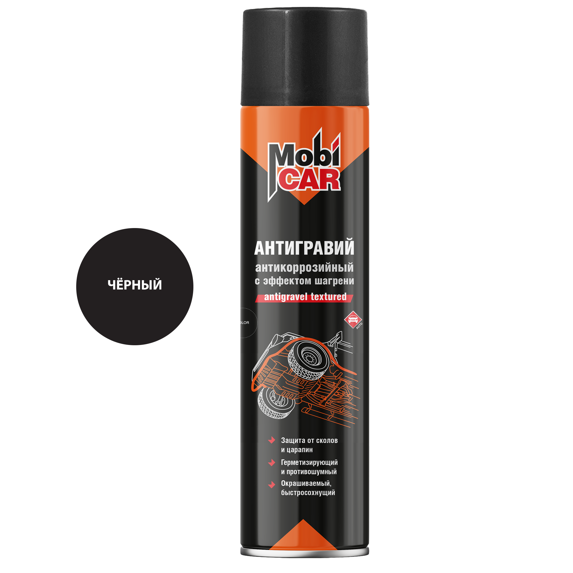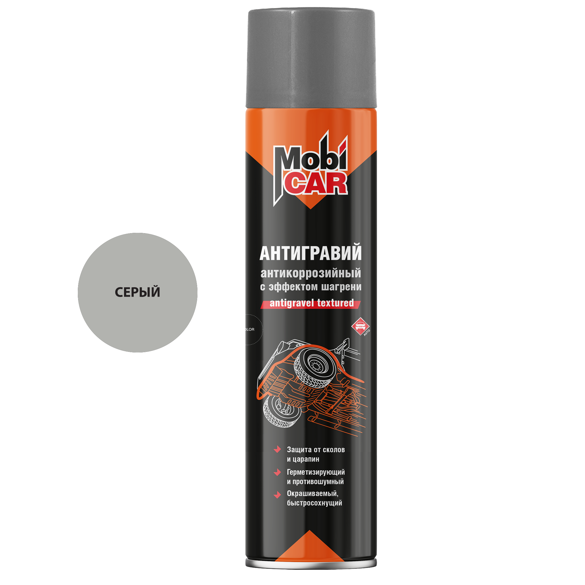 АНТИГРАВИЙ АНТИКОРРОЗИЙНЫЙ С ЭФФЕКТОМ ШАГРЕНИ MobiCAR® предназначен для долговременной антикоррозийной защиты нижней части кузова и бамперов, порогов автомобиля и колёсных арок от абразивного воздействия песка и ударов мелкого гравия. Образует прочное и эластичное текстурное покрытие, сохраняющее свойства в широком диапазоне температур. Обладает высокой адгезией и шумоизолирующими свойствами. Не растрескивается и не отслаивается на морозе. Покрытие устойчиво к воздействию дорожных реагентов и соли. После высыхания может окрашиваться большинством эмалей. Идеально для самостоятельного применения.