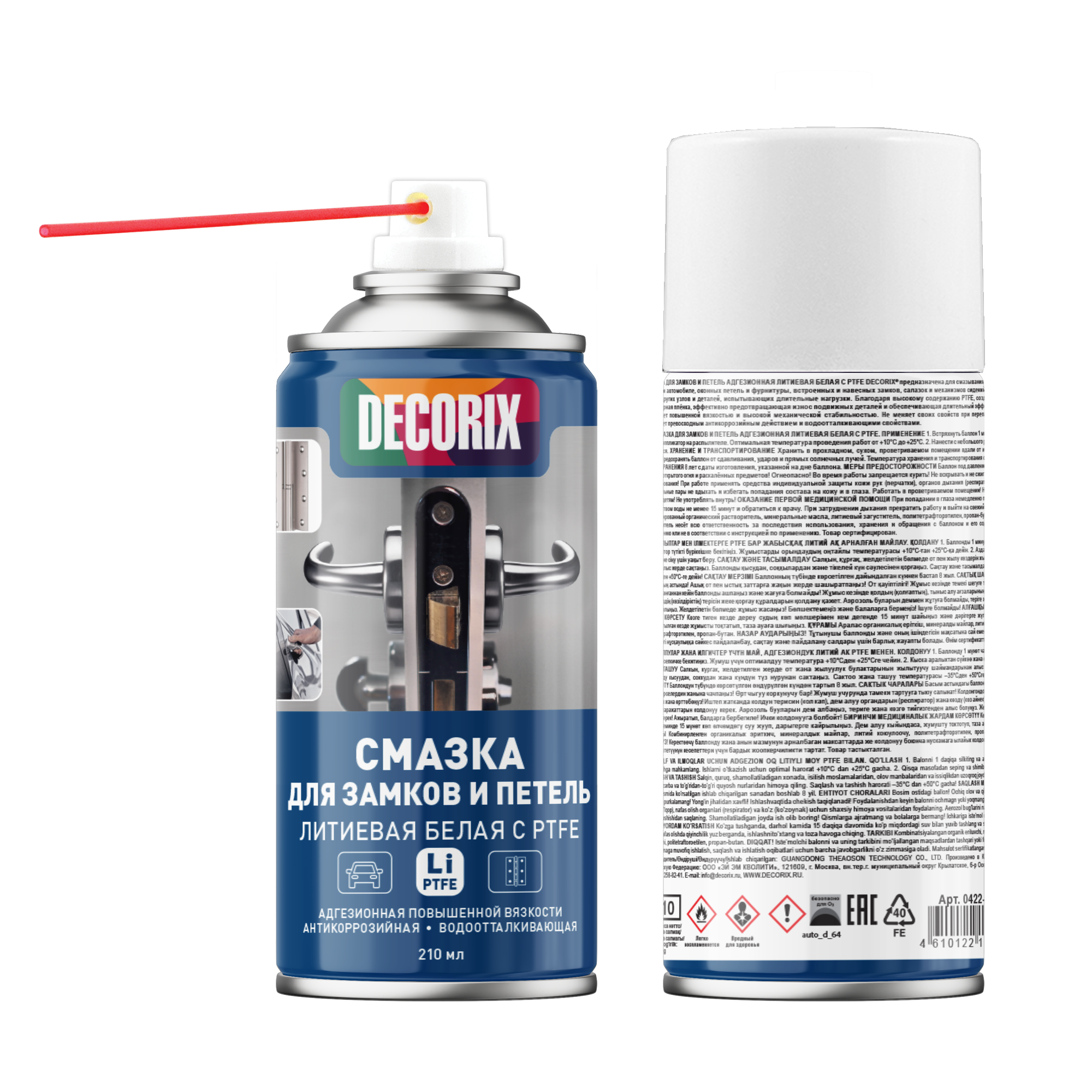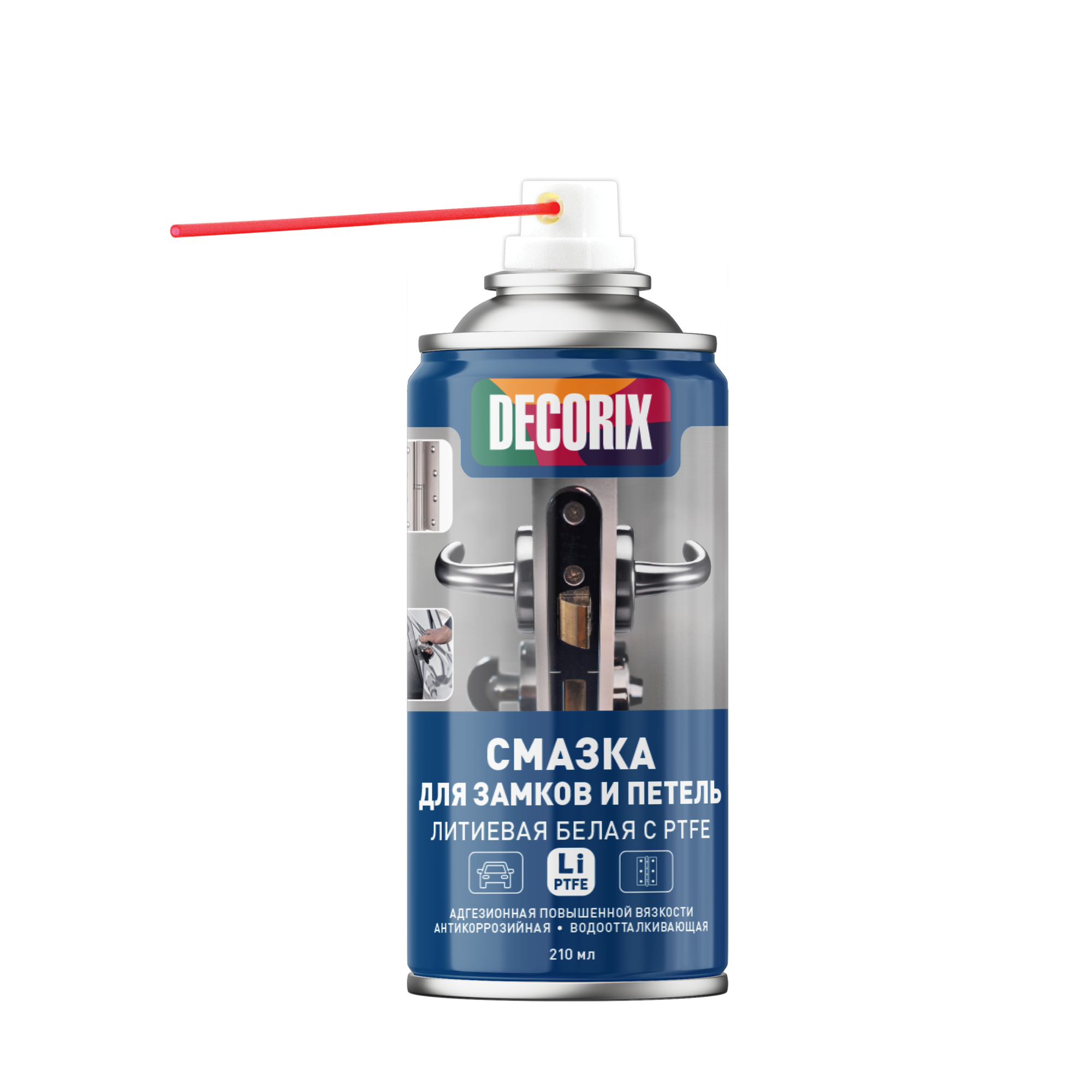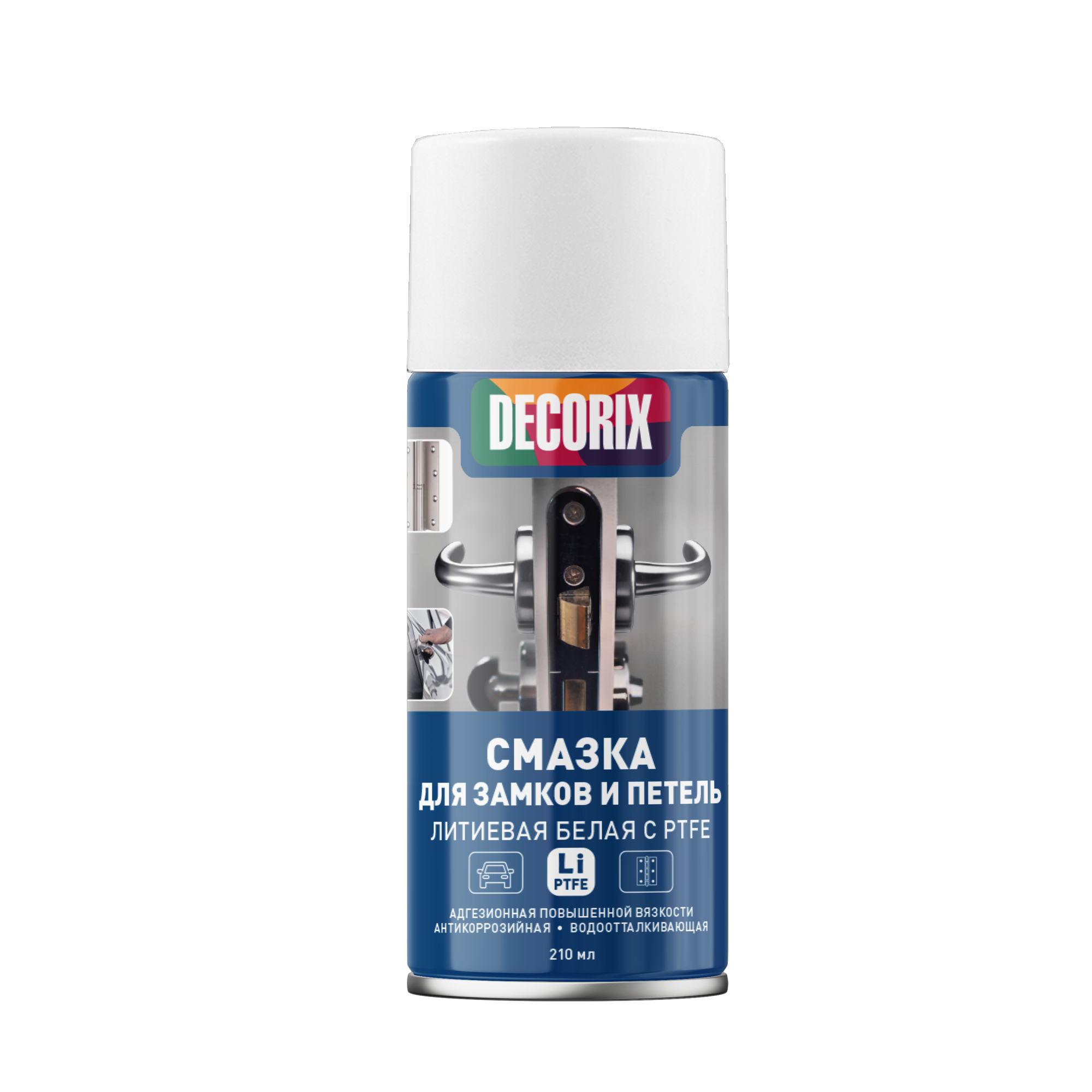 СМАЗКА ДЛЯ ЗАМКОВ И ПЕТЕЛЬ АДГЕЗИОННАЯ ЛИТИЕВАЯ БЕЛАЯ C PTFE DECORIX® предназначена для смазывания дверных петель в доме и автомобиле, оконных петель и фурнитуры, встроенных и навесных замков, салазок и механизмов сидений автомобилей, а также других узлов и деталей, испытывающих длительные нагрузки. Благодаря высокому содержанию PTFE, создаётся защитная полимерная плёнка, эффективно предотвращающая износ подвижных деталей и обеспечивающая длительный эффект смазывания. Обладает повышенной вязкостью и высокой механической стабильностью. Не меняет своих свойств при перепаде температур, обладает превосходным антикоррозийным действием и водоотталкивающими свойствами.