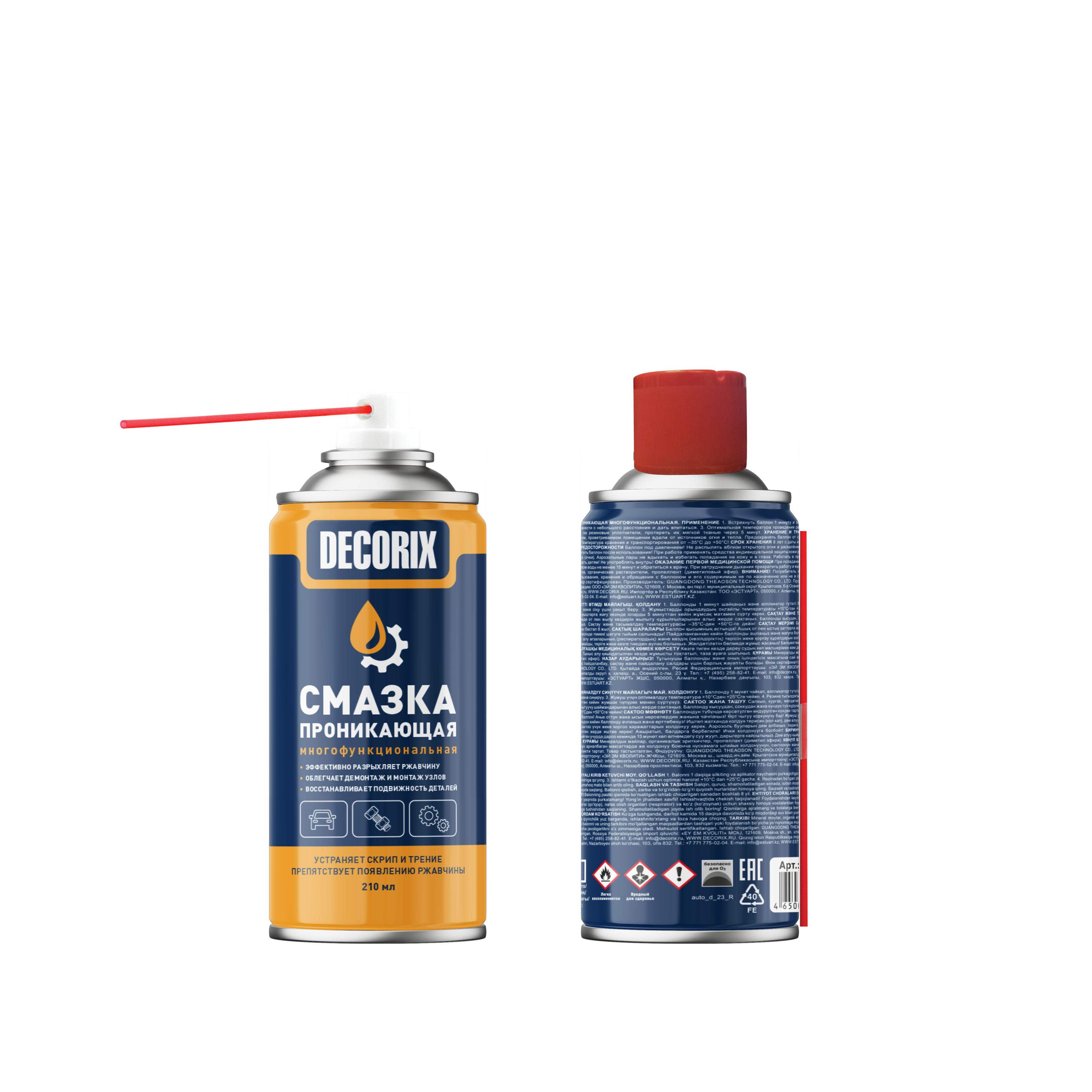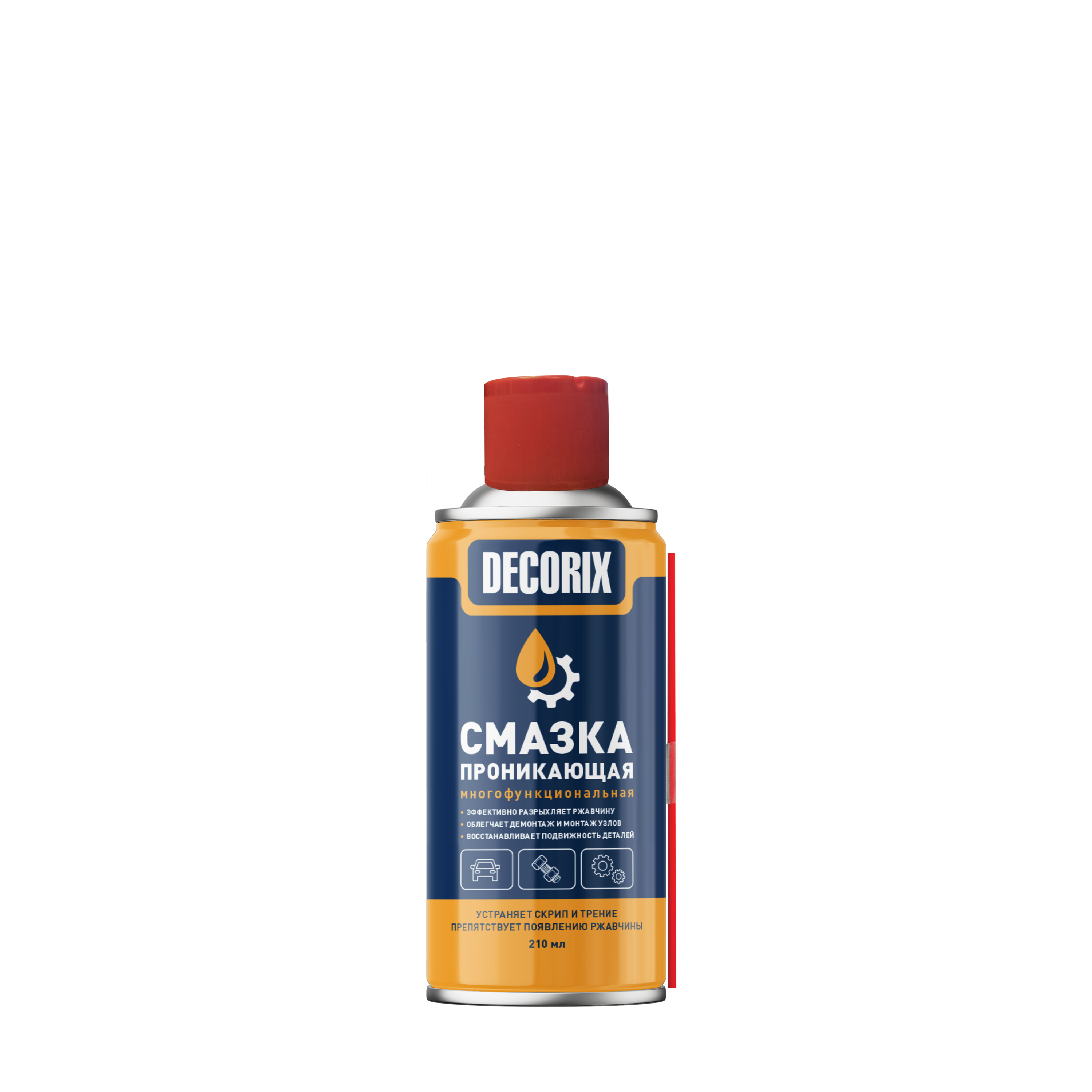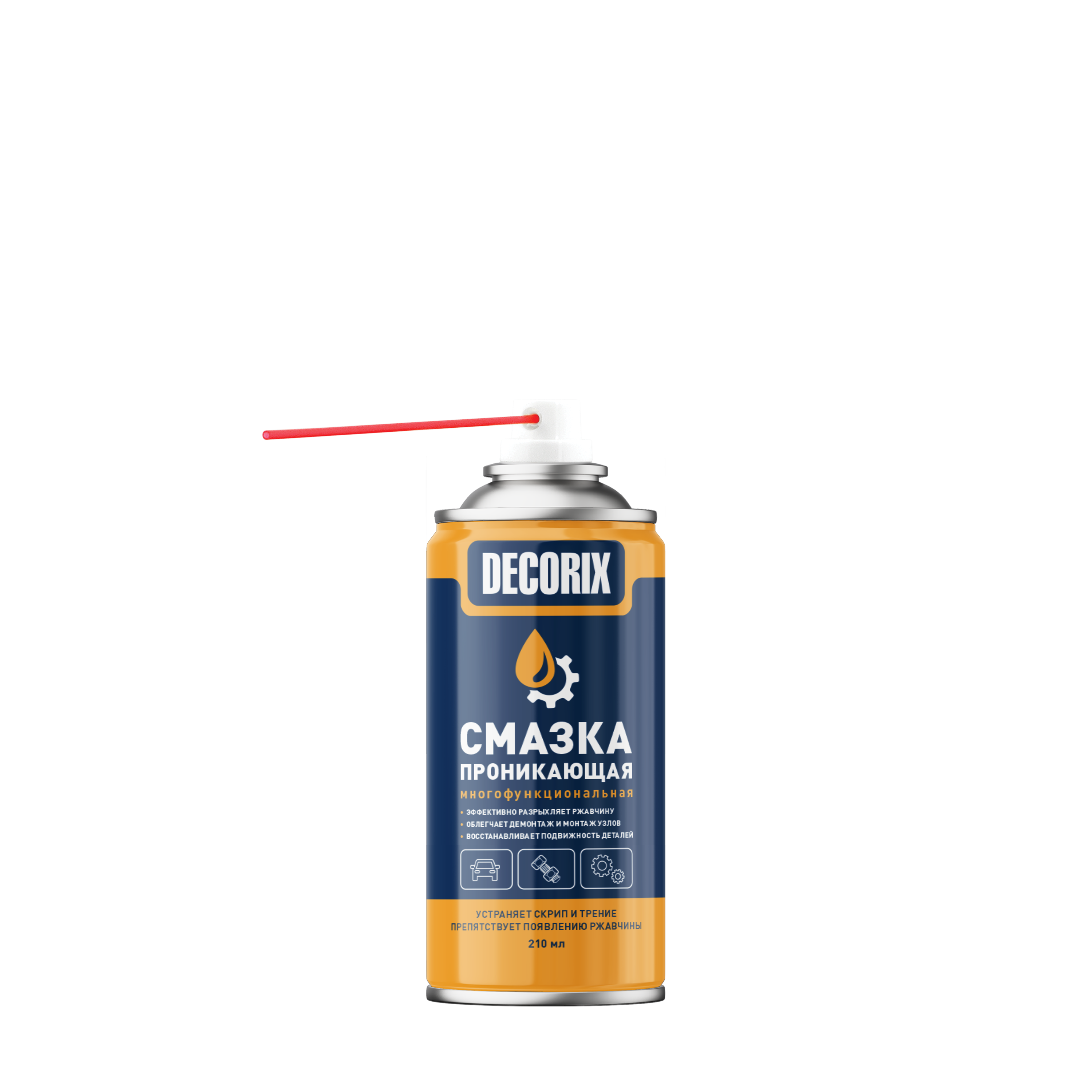 Многофункциональная проникающая смазка DECORIX® 210 мл предназначена для смазывания подвижных механизмов и деталей, а также для эффективной защиты от влаги и коррозии металлических поверхностей. Применяется для обработки шестерёнок, петель дверей, замков, цепей передач, слабонагруженных подшипников и т. п. при уходе за автомобилем, в быту и промышленности.
