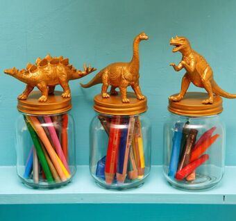 Покрасьте крышки стеклянных банок, добавьте фигурки — получится дизайнерская тара для круп и специй.