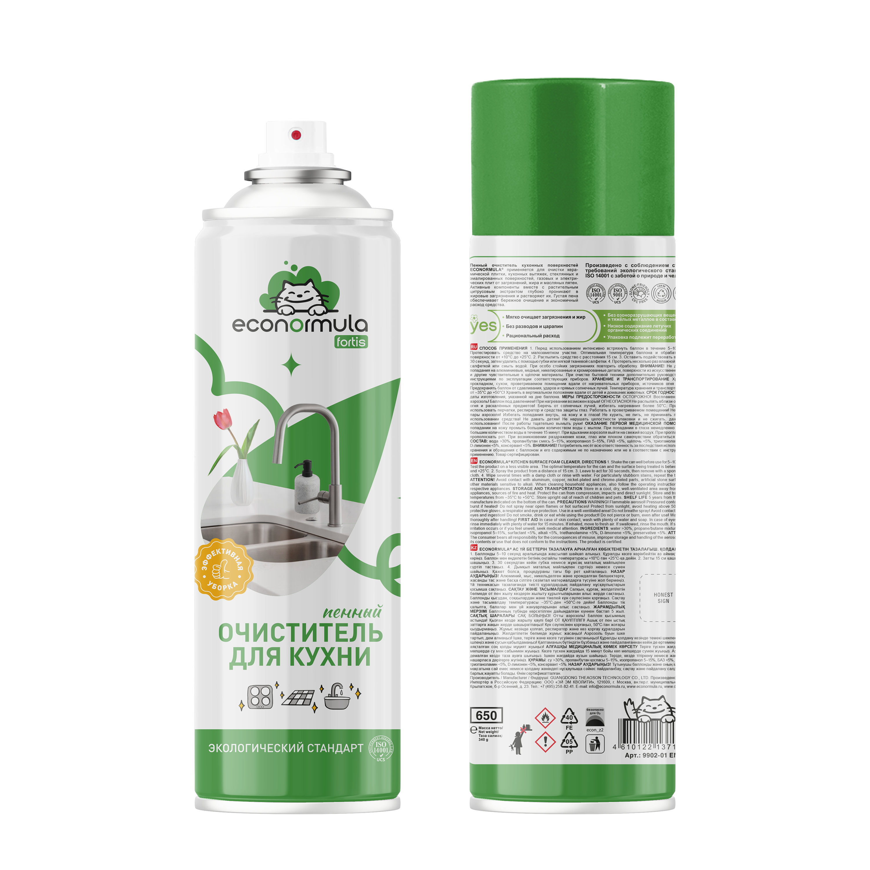 ПЕННЫЙ ОЧИСТИТЕЛЬ КУХОННЫХ ПОВЕРХНОСТЕЙ ECONORMULA® применяется для очистки керамической плитки, кухонных вытяжек, эмалированных поверхностей, газовых и электрических плит от загрязнений, жира и масляных пятен. Активные компоненты вместе с растительным цитрусовым экстрактом глубоко проникают в жировые загрязнения и растворяют их. Густая пена обеспечивает бережное очищение и экономический расход средства. Произведено с соблюдением строгих требований экологического стандарта ІЅО 14001 с заботой о природе и человеке.